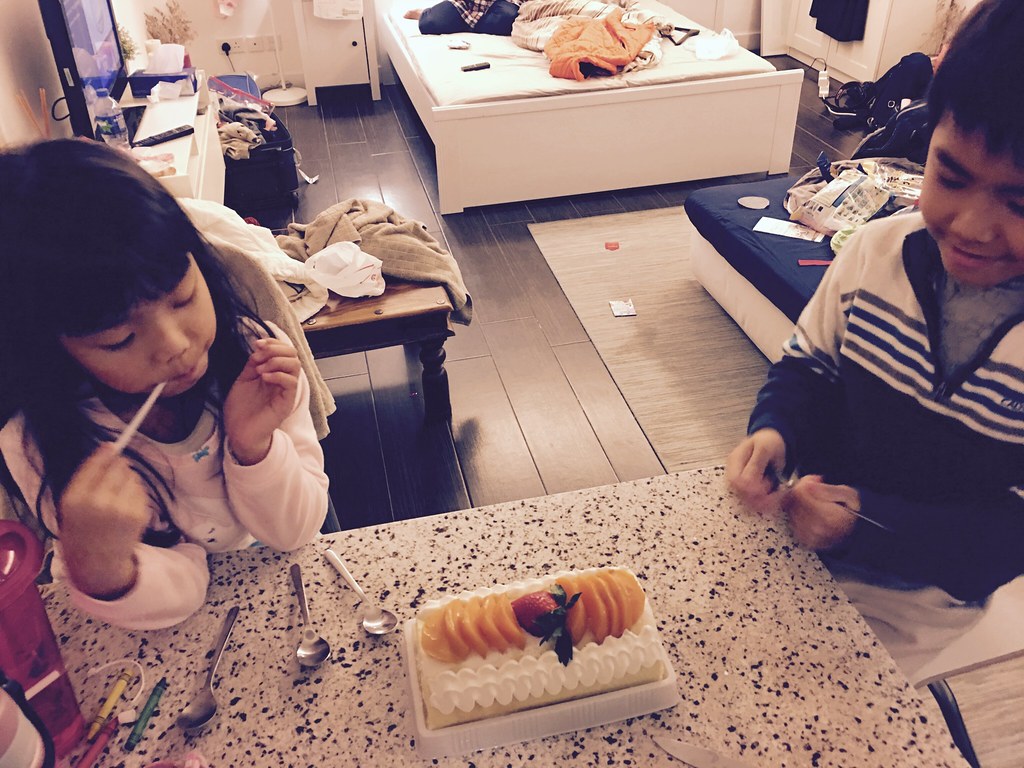 走回住宿的地方,經過麵包店,老婆就說要不要買蛋糕慶生,小孩當然說好,不過卻好像是壽星出錢ㄟ~@@ 兩個小孩吃的最開心。