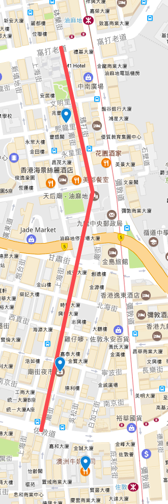 而要注意的是廟街其實被分成兩段,我們是從上面走到下面的佐敦,佐敦那裏根本就豪華區。